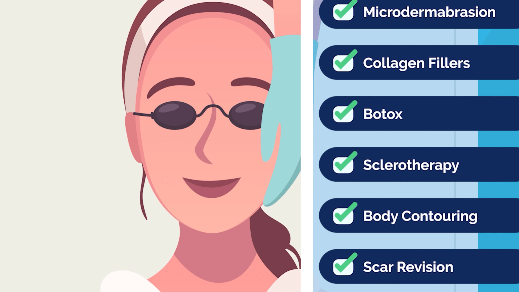 Procedures include laser and chemical resurfacing, microdermabrasion, collagen fillers, Botox, sclerotherapy, body contouring, and scar revision.