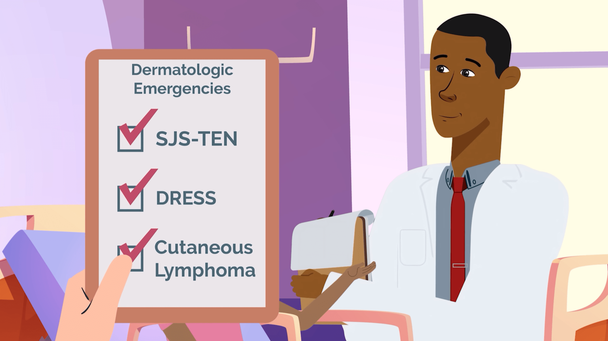 Dr. Johnson: Think of your skin like a superhero suit covering the whole body. It keeps the germs out, helps you feel things like hugs, and keeps you warm or cool. Sometimes, your skin gets grumpy. You might get an itchy spot, a rash, a bug bite, or even pimples. That’s where a dermatologist comes in. Dermatologists examine your skin closely, much like detectives. They might use a special magnifying glass or a tiny flashlight to get a better look. They may even take a little sample to look under the microscope. Your skin can often reveal how your body is functioning on the inside, and dermatologists can use that as a form of X-ray vision to help diagnose more than just skin conditions.