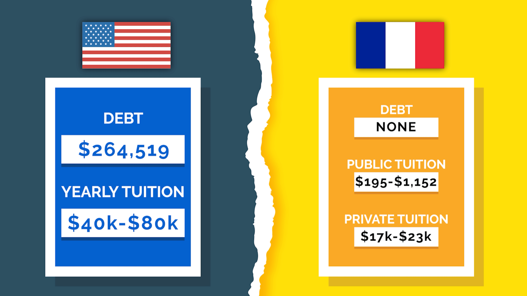 The crisis begins with financial handcuffs. US medical students graduate with an average debt of over $260,000, with yearly tuition costing as much as $80,000 a year. By comparison, French doctors start their careers essentially debt-free, with annual tuition fees ranging from nearly free to €1,000 for public schools and €15,000-20,000 for private.