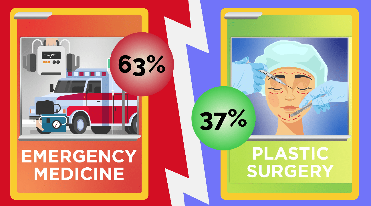 At the top of our list with the highest burnout rate is emergency medicine at 63%. These physicians work on the front lines, treating everything from heart attacks to drug overdoses in high-pressure environments.